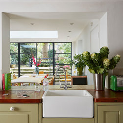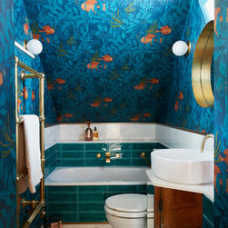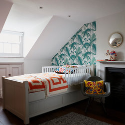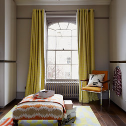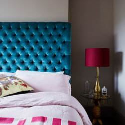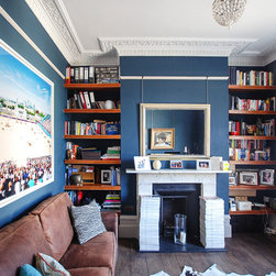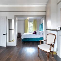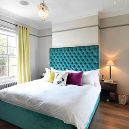 The master bedroom, walk-in wardrobe and bathroom were created with a small tweak in the plan layout. Permission was finally granted to create one door access by moving a doorway by 0.5m and creating a master suite. NLS put back the original Georgian detailing in the bathroom; cornicing, skirting and window frame before adding a 70s twist with the insertion of a floating arabescato marble vanity unit and splash back. Other features include a free standing claw foot bath, a bespoke walk-in shower with cobalt blue and bronze glass mosaics and geometric wallpaper around the entrance complete the look. In the bedroom, floor to ceiling sculptural matt painted cupboards with inset dark gloss veneer offset against heavy bright yellow curtains and a tall deep buttoned peacock blue velvet headboard.