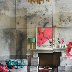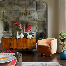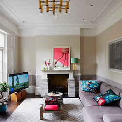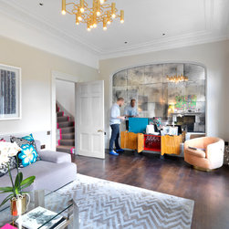 This Grade II Georgian house was refurbished for a young family home. The aim from the outset was to mix different styles enhancing the Georgian features, whilst adding retro 70s glamour. The well proportioned living room occupying the full width of the house still contained the grand original cornicing, tall ornate skirting, french doors with shutters and a handsome marble fireplace. NLS used a three tone grey gradated colour scheme, dark to light, starting off with a dark oak timber floor. The centre point of this room is an NLS designed sculptural, high gloss chestnut and mild steel bar cabinet in front of an antique mirror installation. This bar cabinet has a lift up section for bottles, a double central cupboard for glasses and a secret side cupboard. All three internal sections are painted in different vivid colours.