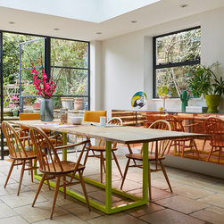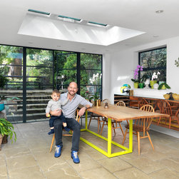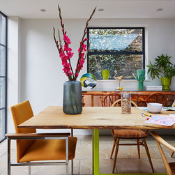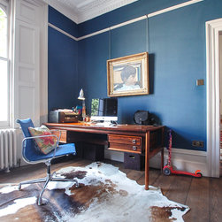 The dining room occupies an existing extension on the lower ground floor but NLS replaced the old windows with anthracite coloured Crittall steel ones to enhance the garden room feel. Custom designed features include a 10 seater dining table with old chestnut planks from Portugal on a lime green powder coated steel base. The focal point is a 2.5 metre polished copper floating side table cabinet with stunning mitred doors and wrap around edges. For the study, the existing features; cornicing, shutters and doors were painted grey to off set with the dark blue walls. A large midcentury rosewood desk by Arne Vodder, a cow hide rug, and original 50s steel angle poise and blue cloth Eames chair, Group EA 107, perfectly complete the furnishing of the space.