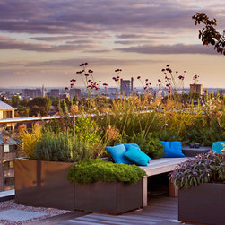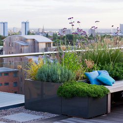 Our client had recently lost her garden when a fire destroyed her family house and, on moving to a new modern 7th floor apartment nearby, she wanted to make the most of the enormous 130 square metre West-facing roof terrace that came with it. She is a keen gardener and wanted it to be a proper roof top garden with real seasonal planting.