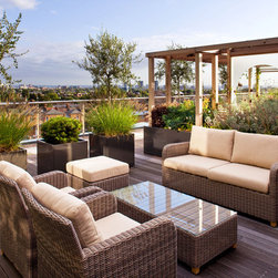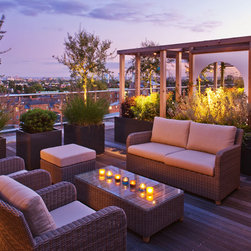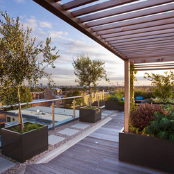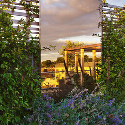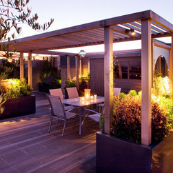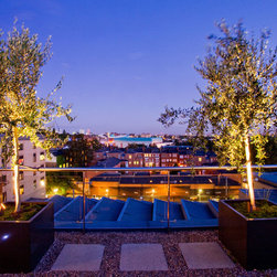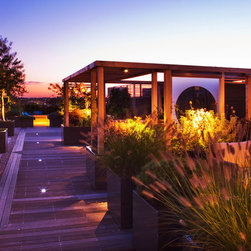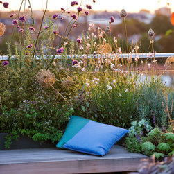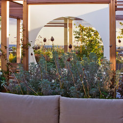 Beyond this structure, in the final third of the roof terrace is the secondary sitting area of built-in benches surrounded by fragrant herbs including chamomile, thyme, sage and rosemary, and perennials and grasses. The view across London from here is spectacular, particularly when the sun is setting. The look is completed with a row of up-lit olive trees, two specimen trees, espaliered figs and a range of lighting.