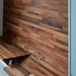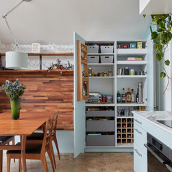 I noticed the couple had a healthy love of house plants so wanted to build space into the design for these. The vaulted ceiling gave us the perfect opportunity to try something a bit different. I had been watching a few music videos of 'myanalogjournal' on youtube and this inspired me to create a bulkhead holding the extractor ducting that house plants could sit on. It works fantastically with the high ceiling. I did away with the island completely and decided to build a bench along one wall with a hinged seat. This would be ideal for storing the kids toys etc when they come in from the garden. Clad in solid walnut with a raked back rest it creates a dramatic focal point at one end of the mid century dining table. Open shelves above it ensure no space is wasted. To the right of this I designed two very practical pantry units. One with lower drawers and a worktop for the toaster with adjustable shelves above and the other for the wine collection.