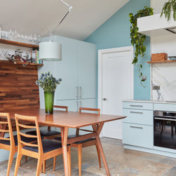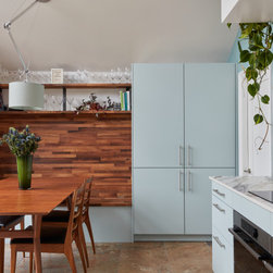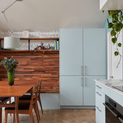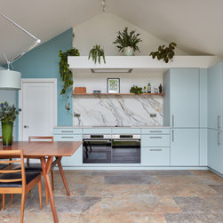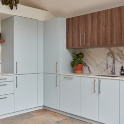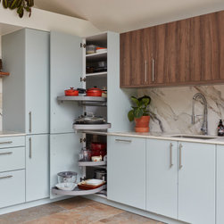 Light blue kitchen with walnut accents. Snaresbrook, East London.