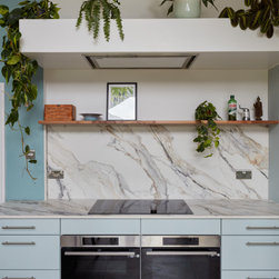 The L shape of the kitchen base units has the hob and ovens centred on one wall with the sink opposite the door as you walk in. This keeps the often dirty sink area that bit further out of view and the clean induction hob and ovens immediately to your left. We used a beautiful Porcelain by Ariastone called Paonazzo in a natural finish. This is a more matt finish which helps to see the marble like veining in a room with so much natural light. (Polished surfaces tend to work like a mirror so you see the reflections more than the worksurface colours and details!) We used the same porcelain for the high backsplashes in the room which because of the diagonal veining also draw the eye up toward the extractor and plants above.