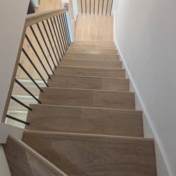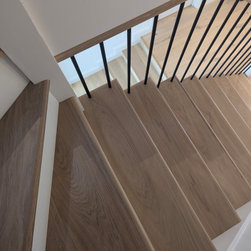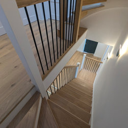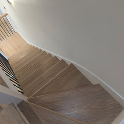 After assessing the staircase layout, we proposed a tailored project plan and design. Our team ensured the wood for the stairs perfectly matched the existing flooring, sourcing and colour-matching the boards in our workshop with meticulous attention to detail. The wood we selected was of premium quality—richer in tone and with fewer knots—and the hand-finished application of a bespoke Osmo Oil combination delivered a beautifully consistent colour.