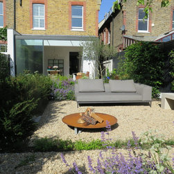 Our clients commissioned us to redesign both front and back gardens and a tricky side passage for their Lion House in Barnes. Built at the beginning of the 1900s, the house was being redesigned to become a clean and bright contemporary home. The new layout extended a versatile and elegant dining room with large sliding glass doors spanning the rear of the house to face the rear garden. A new view was created from the front door all the way through the house to the garden where we positioned a beautiful multi-stem Cornus mas tree to draw the eye.