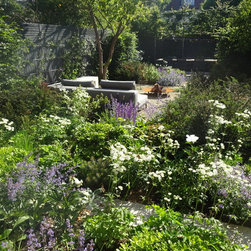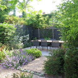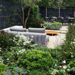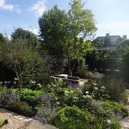 Early on in the design process it was decided with the client not to have any lawn but instead to have a series of terraces and gravel areas linked by a series of paths through wide, flowing planting beds. Buttresses of clipped Carpinus betulus hedge step forwards from the side boundaries to give a sense of progression through the garden and thereby both lengthening and widening the space. A dense covering of climbing plants, Star Jasmine, Clematis species, Akebia quinata, winter flowering Quince and Roses enclose the garden in a rich green, scented tapestry. A series of low clipped Yew hedges give a year-round solidity to the surrounding wide perennial beds.