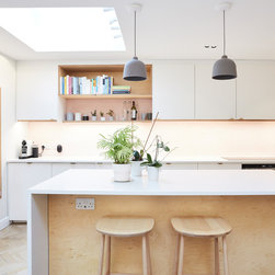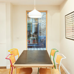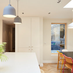 Despite the generous size of the property, an extension was required to provide a new open plan kitchen, dining and living hub. The new wraparound extension was designed to retain a large rear courtyard which had dual purpose: firstly the courtyard allowed a generous amount of daylight and natural ventilation into the new dining area, existing rear reception/ study room and the new downstairs shower room and utility zone. Secondly, as the property is end of terrace a side access from the street already existed, therefore the rear courtyard allowed a second access point at the centre of the ground floor plan. Around this entrance are located a new cloaks area, ground floor WC and shower room, together with a large utility zone providing most of the utilities and storage requirements for the property.