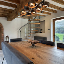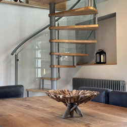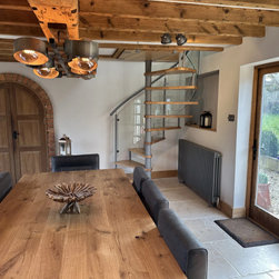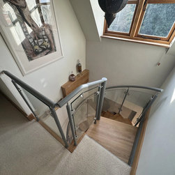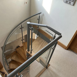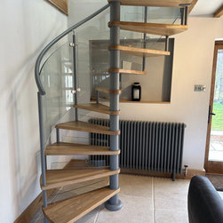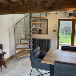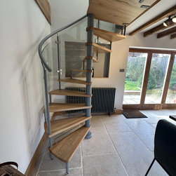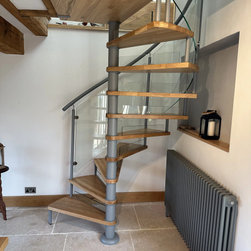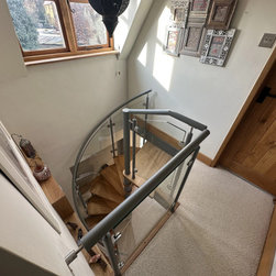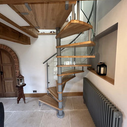 Lovely cottage spiral staircase with oak treads and curved glass railing