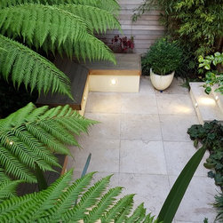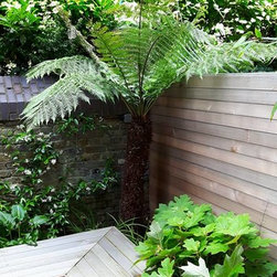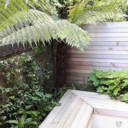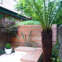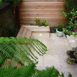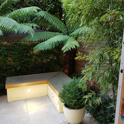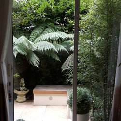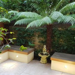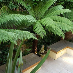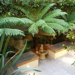 The design process: After presenting three sketches proposals , the client went for a rectangulat and minimal space. Three tree ferns were used in the front wall to create drama and interestest. Two seats were built to create a seating area for entertaing