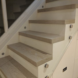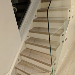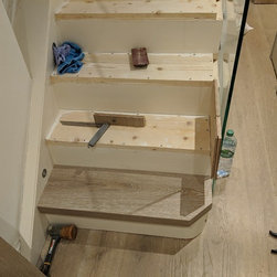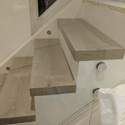 To fix the treads into place, we had to cut a section of wood out of every step next to the glass balustrade. This allowed us to slot and fix the new step into place. Every step was cut with a mitred edge at the front and sides. We then fitted a piece of wood with matching mitred edges to the face of the steps. These were glued into place with an invisible seam. The boards we used were 20 mm thick, but by adding the extra wood, they looked much thicker at around 50 mm.