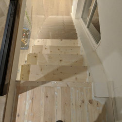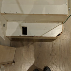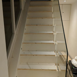 Our first job was to investigate how the stairs had been built. We knocked a hole into the bottom step, which revealed that the treads were integrated into the structure. This meant that they had to stay in place. Removing the large glass partition wasn’t an option either, so we had to work out how to fix in the new treads without weakening the structure.