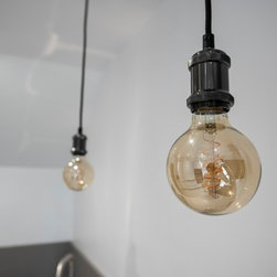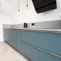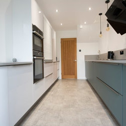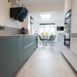 The finished design detracts from the long galley space and reduces the impact of the tall housing units. The concrete apple inspired the minimalistic urban industrial styling resulting in a sleek understated look which works as well as it looks.