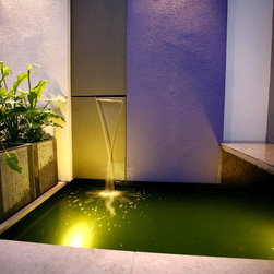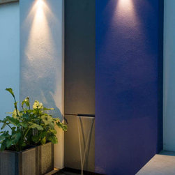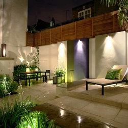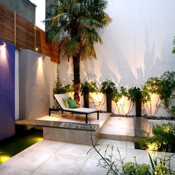 The carefully designed lighting plan maximises the effect of the water feature, panel walls and trellis at night and includes accent lighting on a row of hand-made stoneware pots.
