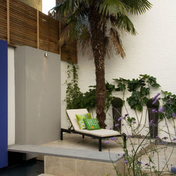 The space available had a number of design challenges: it would be viewed mainly from above, from the formal drawing room on the first floor, but still had to have access from the owners' teenage sons' rooms on the ground floor; it was quite dark and dank; the rear retaining flank wall of courtyard was prone to damp and moisture; and it was overlooked by a public footpath at the rear where the ground was much higher.
