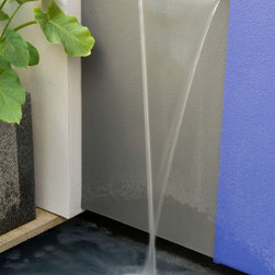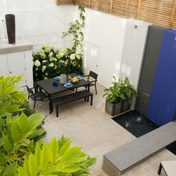 The design brief was to create a modernist style space incorporating a water feature and some touch of colour. As a key element of the design, Charlotte Rowe Garden Design decided to create a series of panelled walls to sit in front of the flank wall which would also provide the opportunity to bring some colour into the space. The panels are painted in a range of grey and deep indigo blue and are topped with a hand-made trellis which helps screen the courtyard from the rear.