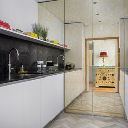The kitchen, although bijou, incorporates clever, slim larder storage hidden behind antique mirrored doors.