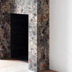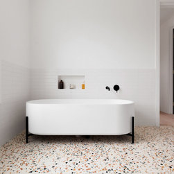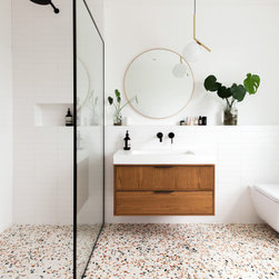 The white rectangular wall tiles are deliberately stack-bonded to echo the arrangement of the rear extension; the terrazzo tile flooring is a bold contrast.