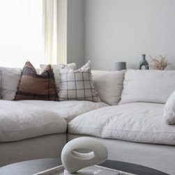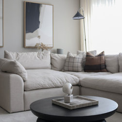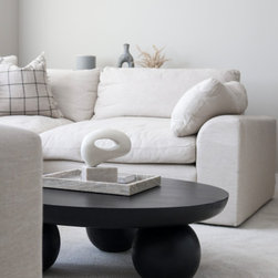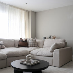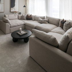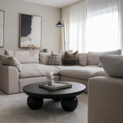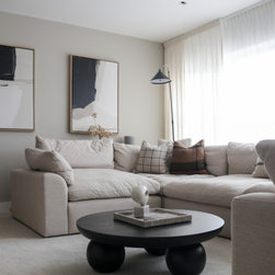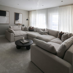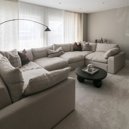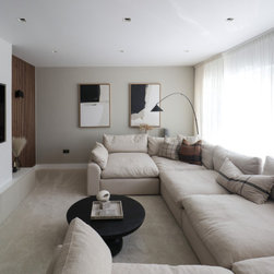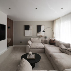 Ensuring comfort was central in creating a cinema room tailored to accommodate a large family. The focal point is a generously sized U-shaped sofa, inviting relaxation and communal enjoyment. Warm wood accents, designed with a modern touch, complement the space, offering both comfort and style.