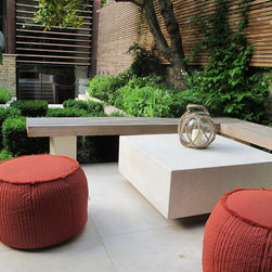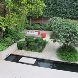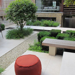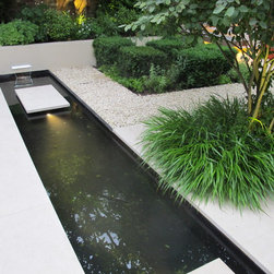 This contemporary urban garden is a design classic with cream limestone, a water rill cutting across the garden, strong architectural bone structure and rich planting.