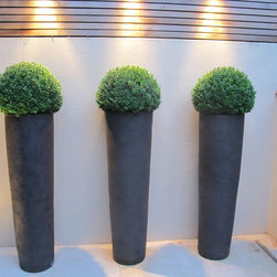 Tall stoneware planters placed on the lower terrace and are lit from above and planted with Buxus globes and there is a large shallow discus-shaped planter on the storage cupboard, planted with culinary herbs.