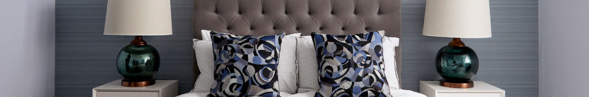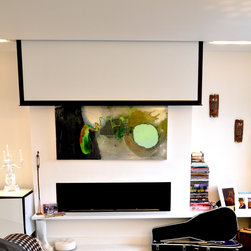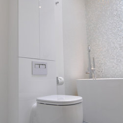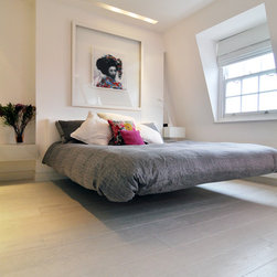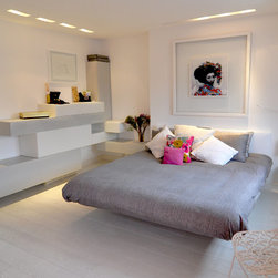 The focal point of this minimalistic and contemporary bedroom is a floating bed. Few contemporary accents, like the chair and table lamp keep the look very modern. White and grey units blend into the wall, hiding a lot of storage space. Accent pillows and a stunning art piece above the bed is what makes this bedroom warm yet a very neat space.