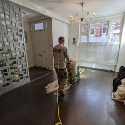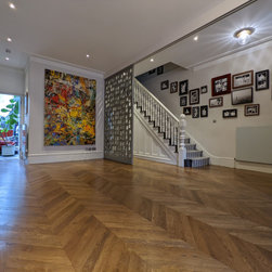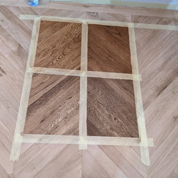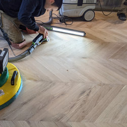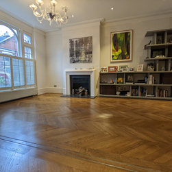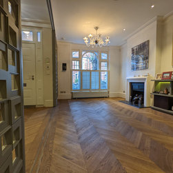 This classic terraced town house located in Fulham’s exclusive Lion estate was fully refurbished a few years ago by the current owners. But the customers were never happy with the colour of the oak chevron parquet fitted by their builder in the large living room, entrance hallway and downstairs toilet. We were contracted to expertly refinish the floor to a lighter colour much closer to the customer’s preference. The customers were very happy with their newly refinished floors.