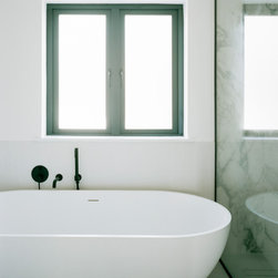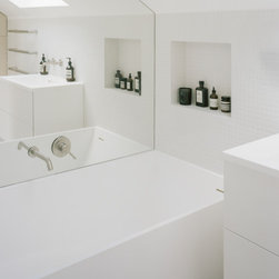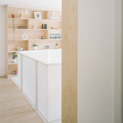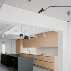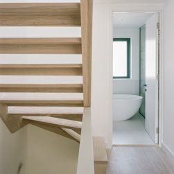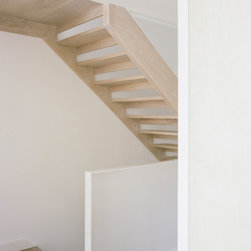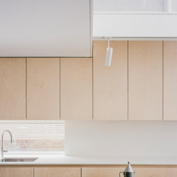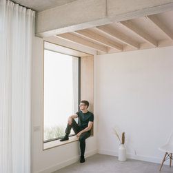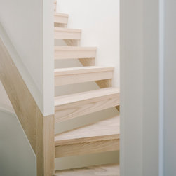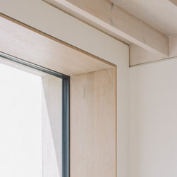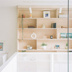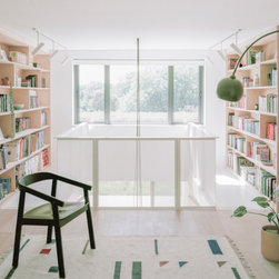 High-level light streaming in from the first floor - through the mezzanine library helps the family to feel intimately connected to the changing of the seasons. The simple material palette of white oak parquet, birch faced ply and exposed timber beams respond to the client's expressed interest in honest materials and 'industrial' space.