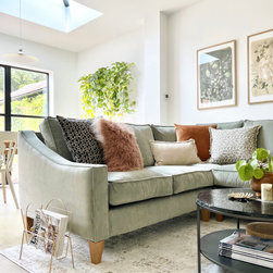 Corner sofa in a performance velvet offering plenty of seating for socialising and watching TV in the open plan family space. Colours chosen to compliment the biophilic elements of the design.