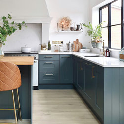 Modern classic blue shaker kitchen with a French canopy hood, mixing quartz and oak worktops.