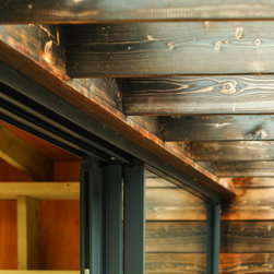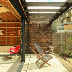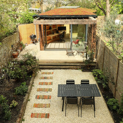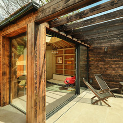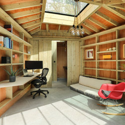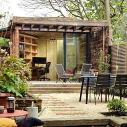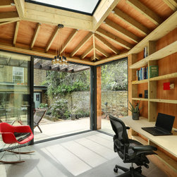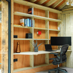 Many garden rooms are a simple square box, but this project had to be different because of the odd shape of the garden. We combined the geometry with a raw exposed timber structure to create an interesting garden office space. The oversized stud work wall is clad in seared larch cladding on the outside with 170mm of insulation and plywood internal wall lining. The internal part of the timber studs projects one foot into the space creating a shelving system and tables cantilever from the structure allowing for a flexible and functional space. Large glass sliding panels frame the garden with a central skylight capping the vaulted roof. Externally a green sedum roof blends the structure into the mature surrounding garden.