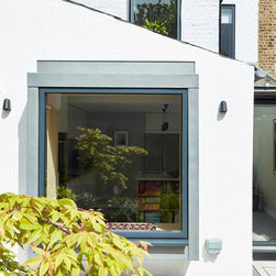 Despite this refocussing of the brief and budget, due to the condition of much of the existing fabric (both rear & side extensions were in very poor condition) together with requiring new kitchen, bathroom, WC, utility, windows and extensive decoration & storage throughout, the budget was still stretched and therefore the decision was made to retain the existing side & rear extensions; upgrading, re-insulating & damp-proofing as required. For practical purposes it was then decided to re-clad the side extension with pre-patinated zinc in order to fully weather this element, and also to provide a sufficiently workable material to deal with the numerous awkward junctions present.