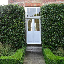 Evergreen plants around a doorway