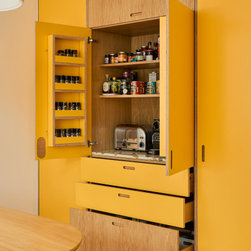 The layout is a typical L shape with a prep island and a storage zone encapsulating a pantry flanked by a full size fridge and full size freezer. In terms of details the handle is a simple routered pill shape. I wanted to keep the wall units clean though so designed an overhanging door in front of some extra thick plywood. This means each wall unit is easily opened from underneath without the need for a handle or to press on the door front as you would with 'tip on' opening mechanisms.