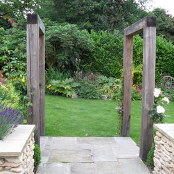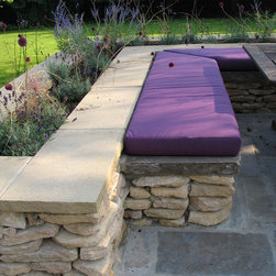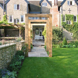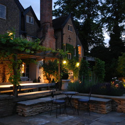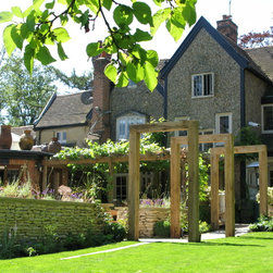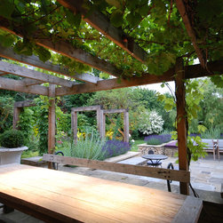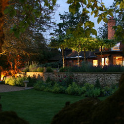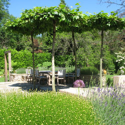 The client was ready for a change to fit in with their changing lifestyle and tastes. In particular, they wanted a much larger terrace off the kitchen with more space for seating and dining. We doubled the size of the terrace and created a raised bed of dressed limestone around its perimeter filled with sun-loving plants including lavender and Santolina. Two large L-shaped stone seats were built to fit snugly against the raised beds and a large French oak pergola frames the view to the stream, while on the other side the view is framed by four umbrella-topped plane trees.