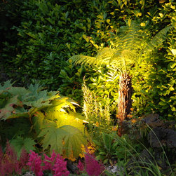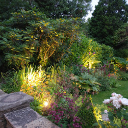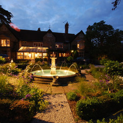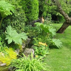 The planting was completely re-designed with mass planting of perennials and grasses, using coordinated colours and foliage amongst the existing shrubs. There is Mediterranean planting on the main terrace and around the pool; marginal planting along the edge of the stream to soften it and make it more natural looking. The lawn was re-shaped to give it a slightly more formal appearance; in particular under two mature willows, the lawn was replaced by shade-tolerant planting including hostas and ground cover to give a more coordinated mat of green under the trees.