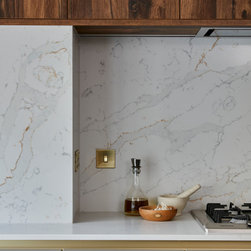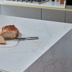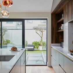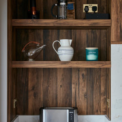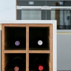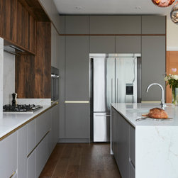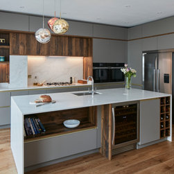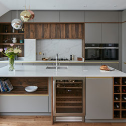 A full height contemporary kitchen in earth grey with dark oak accents, a brass handle line detail and Calacatta Gold quartz worktops. The design includes a breakfast area with open shelves, wine fridge and rack, a large American style fridge freezer and lots and lots of storage!