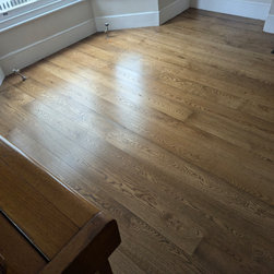 Stage one of the project involved preparing the subfloor, including careful levelling and the installation of acoustic insulation. The existing floorboards had undergone multiple rounds of sanding and were no longer structurally sound. The rooms were noticeably inclined and that required careful correction to achieve a level surface and maximum room height. The selected random width oak boards featured a traditional profile with a natural grain, chosen to complement and preserve the character of the home. The project incorporated a random width layout, using a considered mix of three different widths of oak boards (20x180mm, 20x210mm and 20x160mm) contributing to a more natural and characterful finish. A bespoke colour finish was applied, carefully tailored to suit the property’s period features and overall traditional aesthetic.