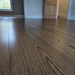 Rich, warm ebony coloured oak flooring was selected for this project. Generously proportioned random width boards were chosen, creating a bold and refined aesthetic throughout the home. The installation spanned the ground floor, including a double living room and expansive entrance hallway, as well as the two upper floors. To ensure a smooth and efficient process, the project was carefully divided into two manageable stages. Particular emphasis was placed on precise setting out and accurate alignment, ensuring a cohesive flow and a consistently high standard of presentation across all areas of the property.