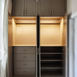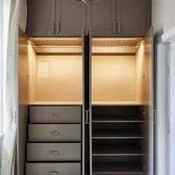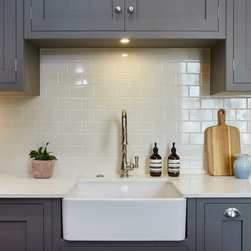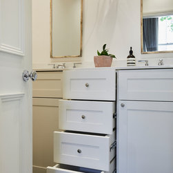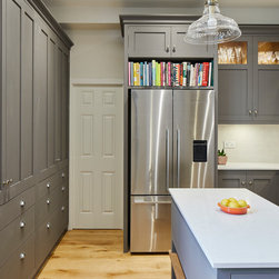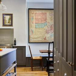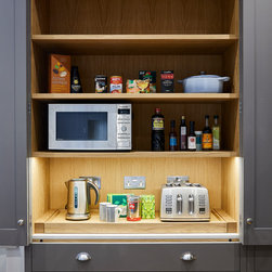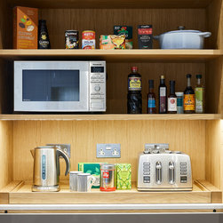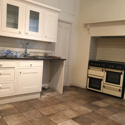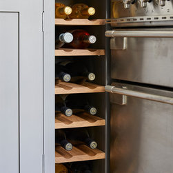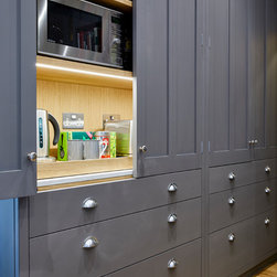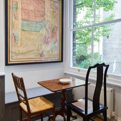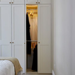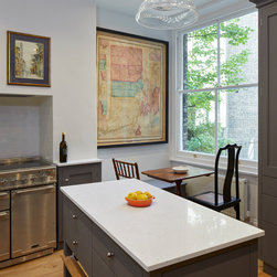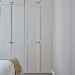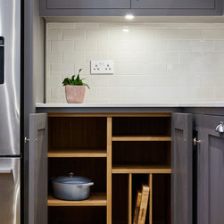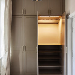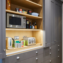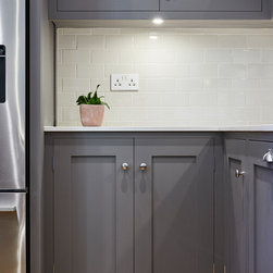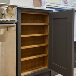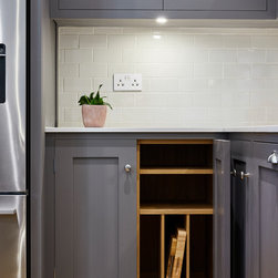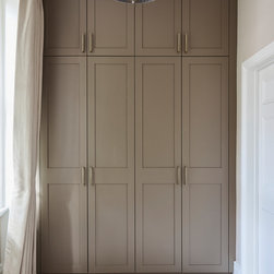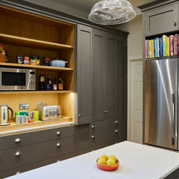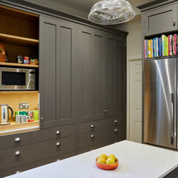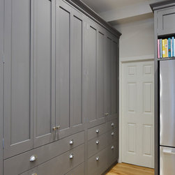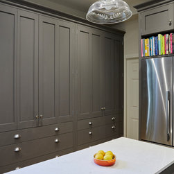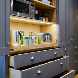 Huntsmore worked with kitchen designers 'Holland St, Kitchens' who created this large fully bespoke shaker kitchen. The space was badly configured, with a slim doorway leading through to the hallway on the otherside. It was decided that it would better to close this section off to get more cabinetry and storage space. The original entrance doorway was also altered so that the large pantry unit to the right hand-side could be fitted. The pantry drawers were made specifically to incorporate the client’s existing casserole dishes and pots and pans. This meant we had to reduce the doorway width and installed sliding pocket door system.