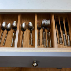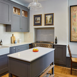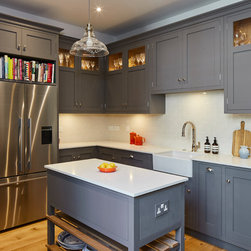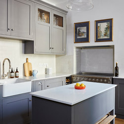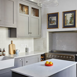 Everything in the kitchen was fully bespoke, designed to the client’s exacting requirements. The cabinets were made of oak with the doors and frames made in poplar wood. The kitchen was finished in Little Greene’s ‘Lead’.