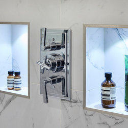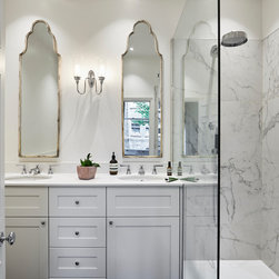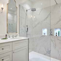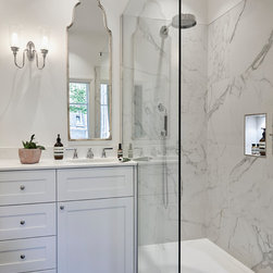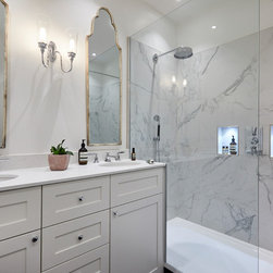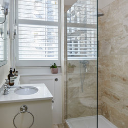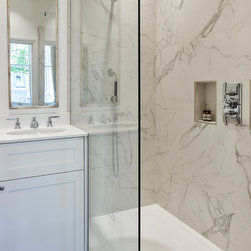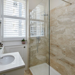 Three of the bathrooms were fully reconfigured and renovated, with marble and stone tiles used throughout.