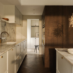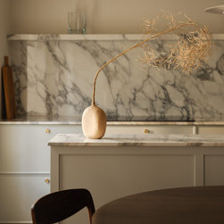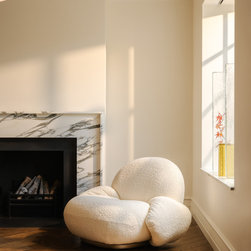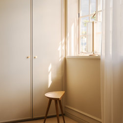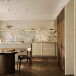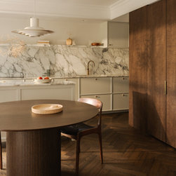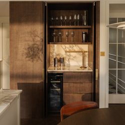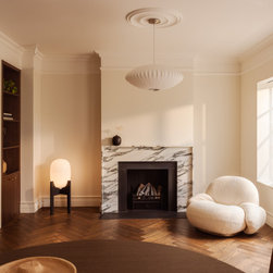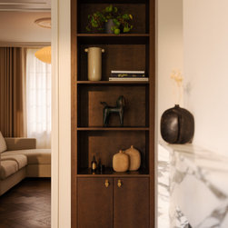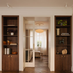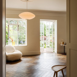 Located in Hampstead Garden Suburb’s conservation area, this Arts & Crafts semi-detached home has been sensitively modernised to suit a young family while meeting strict Trust regulations. The ground floor transformation is anchored by a bespoke dark oak joinery element that stretches through the interior, organising flexible living zones, concealing storage and utilities, and incorporating sliding pocket doors to modulate light and flow between spaces. At the heart of the home, a bright kitchen and living space opens to a raised brick patio, where clay planters create a seamless indoor–outdoor connection. A draped snug provides an intimate retreat, while the converted garage delivers additional utility and functional space. New double-glazed windows improve energy efficiency, and soft curtains filter natural light, enhancing the sense of refinement. Material choices reference the home’s heritage character, with dark oak echoing original handrails, complemented by light marble and natural stone finishes. The result is a series of elegant, contemporary family spaces that respect and enrich the property’s period features.