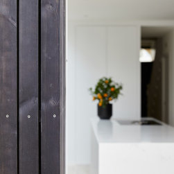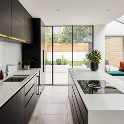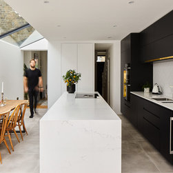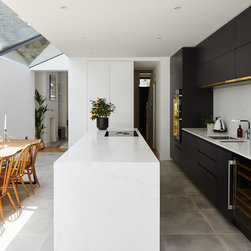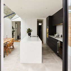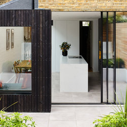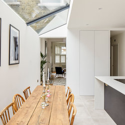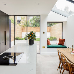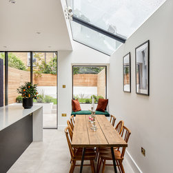 The position and size of the windows and doors needed to work as much with the external appearance as they did with the internal layout, which required a fair bit of strategizing on our part. In particular, because the extensions to the side and rear made the centre of the kitchen-dining room dark, we ensured that the large frameless roof window was as large as possible to flood the room with natural light.