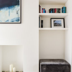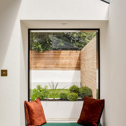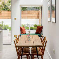 Designating the more light-filled space for everyday living, we secreted the WC under the stairs, which was now the darkest part of the house. Carrying this new space across the back of the kitchen created a large utility and boiler cupboard hidden behind two white acoustic doors which reduces any noise from the washing machine or dryer. The patio doors were also perfectly sized to stack-up behind the wall of kitchen cupboards, leaving the maximum opening out into the garden. Doubling as a toy chest, the picture window seat invites a cosy play corner in the heart of the home.