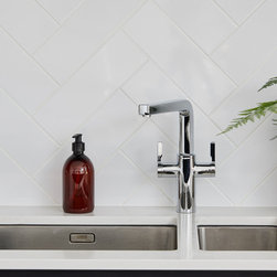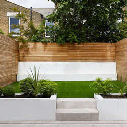 We made the kitchen and patio the same level and the external tiles received a clear non-slip coating, so they look identical to those in the kitchen (the patio door frame was recessed into the floor and a small drainage channel in front of the door stops any water coming into the property). This continuity across the inside and outside space when the doors are open on warmer days adds a real openness. Originally there was a step down on to the patio, this then sloped up to the rear of the garden. We used excess earth from the levelling of outdoors with indoors to provide a raised lawn area at the rear. White box planters and in-built seating reflect as much light as possible. Because the garden is north-west facing, this action of stepping up into light rather than stepping down into a dark space is a literal uplift. Plus it provides the perfect spot for a post-work drink, a weekend get-together, and those summer barbecues!