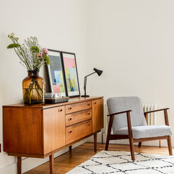 It may feel counter-intuitive, but we decorated with dark colours in both the bathroom and the WC to create the illusion of depth as this softens corners and edges. It also added a dose of drama to the functionality of these rooms that we further embellished with wallpaper in the WC. We used pieces of reclaimed furniture and brass fittings to create character and warmth. The high contrast of dark and light when stepping back out into the white-walled living space then upholds the sense of expansive space that we were aiming for throughout.