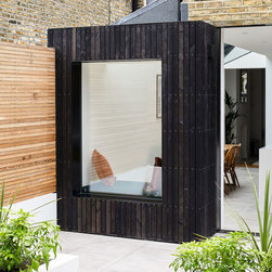 The other remaining bricks retained from the demolition works were used to build the new side wall on to the neighbour’s property. We painted the extension’s timber cladding with a black stain and UV protection, this allowed some of the natural tones and grain of the timber to come through but provided a hardwearing matte finish. The black timber cladding then extended across the side wall of the other neighbour’s rear extension. This wall was in very bad condition, so we were able to hide it while continuing the datum line from the top of the patio door across into the garden. It also acts to balance out the proportions of the box extension and draws the eye into the outdoor space.