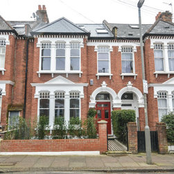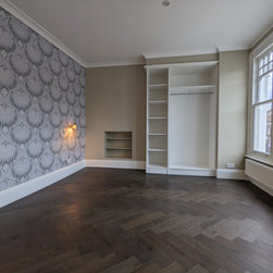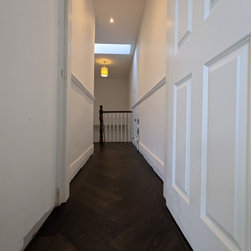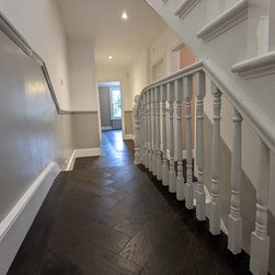 This rich, dark Jacobean oak herringbone parquet project took place across the two upper floors of this beautiful Victorian terrace in the Heaver Estate Conservation area in Balham. The oversized herringbone parquet blocks were framed by a single row border with mitred corners. The first floor part of the project included two large bedrooms and a long hallway and a set of steps leading up to the second floor. The second floor project included another large hallway and two further large bedrooms with another set of steps leading to a mezzanine space. This exclusive estate in South West London features large period homes with ornate Victorian architecture, spacious rooms and beautiful gardens. A perfect setting for a rich dark Jacobean oak parquet.