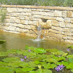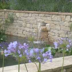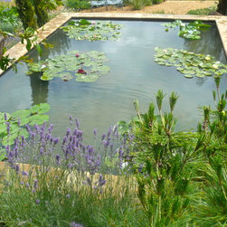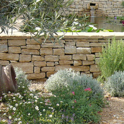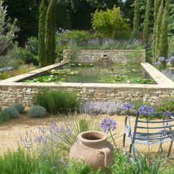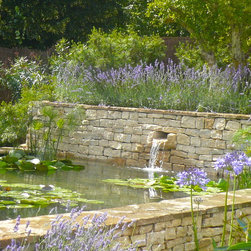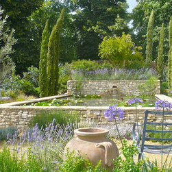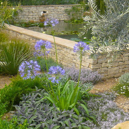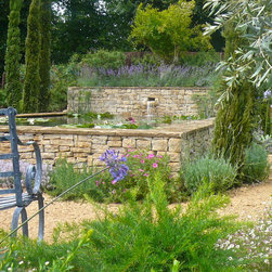 We built a raised formal pond with cotswold dry stone , hand carving a water spout out of a larger piece of stone. A lavender hedge was planted at the rear, with a small medlar tree. The mediterranean planting continued around the sides of the pond, with two 100 year old Olive trees, agapanthus, tall Italian Cypress trees and dry loving plants and shrubs.
